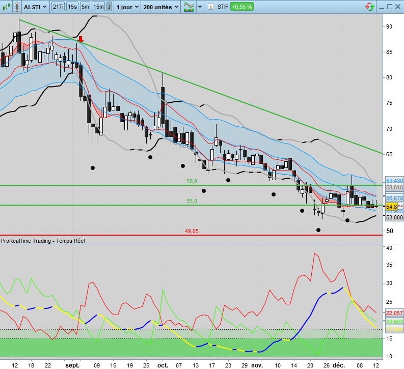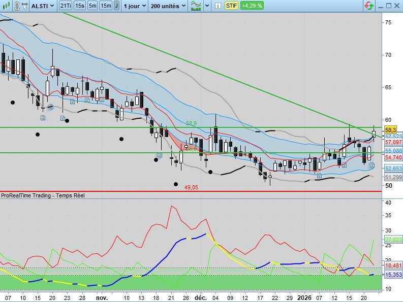 ATRS (Enveloppes orange) : Le cours rebondit sur la borne basse de l'enveloppe ATRS. Une sortie par le haut de ce canal (vers 55-56 €) validerait un retournement de court terme vers la borne supérieure.