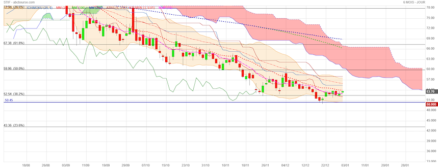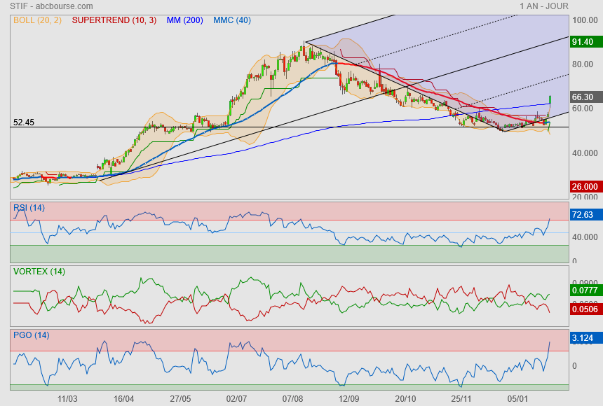 L'action STIF semble chercher un point bas (bottoming process) après une chute sévère depuis les 91 €.