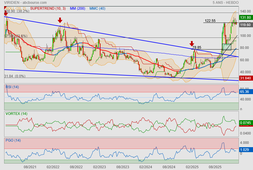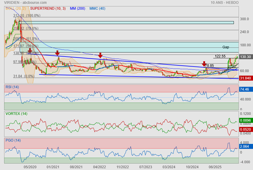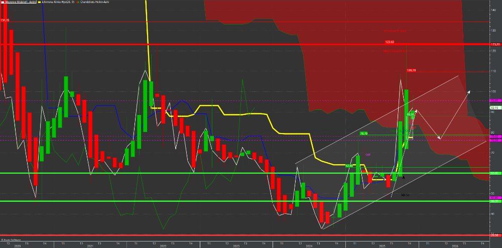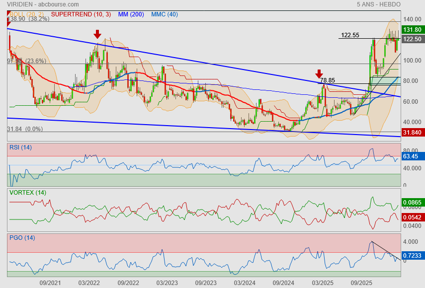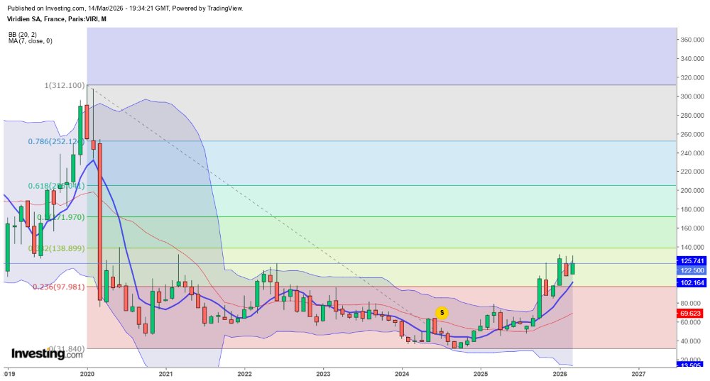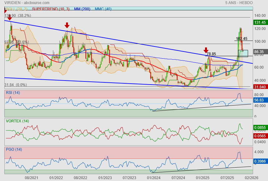 Je pense pas, on a un gros nuage en mensuel a contourner. On a réintégré le canal haussier débuté en 2024. Sauf surprise comme l'intégration de la face technologie / IA par le marché je mise sur une hausse dans ce canal qui nous amène direct a la sortie du nuage courant 2026 par le passage des 109€. Bien entendu avec toutes les secousses dont la VAD sur Viridien nous gratifie .