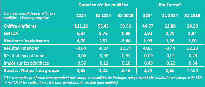 Les sociétés M2I et O2i ayant été cédées respectivement le 30 mars 2025 et le 1er juillet 2025, les comptes consolidés réels de Prologue au 1er semestre 2025 intègrent :