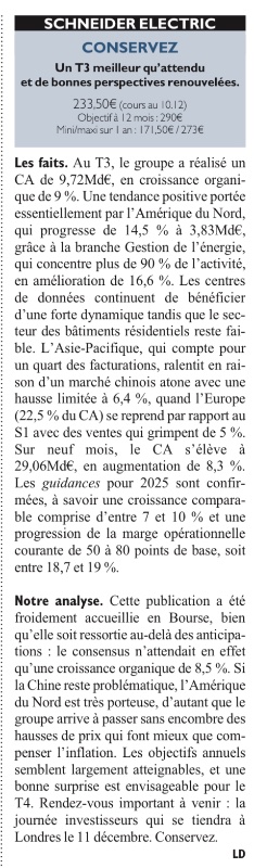 (CercleFinance.com) - UBS maintient son conseil à l'achat sur le titre et laisse son objectif de cours à 275 E avant la publication des résultats du 2ème trimestre 2025. Cet objectif fait ressortir un potentiel de hausse de 21% du titre du spécialiste de la gestion de l'énergie et des automatismes industriels.