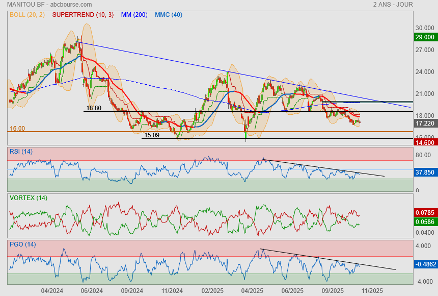(Zonebourse.com) - Manitou perd plus de 5% après la publication d'un résultat net de 32,7 millions d'euros au titre des six premiers mois de 2025, contre 81,8 millions au premier semestre 2024, ainsi que d'une marge opérationnelle courante (MOC) de 5,1%, en baisse de quatre points.