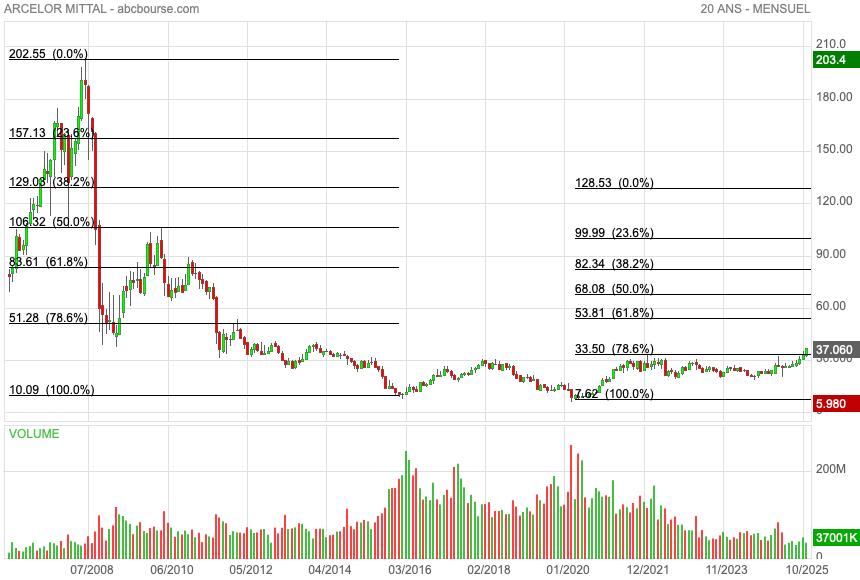 arcelormitttal connait une embellie depuis des mois et voici ce que donne la configuration graphique..
