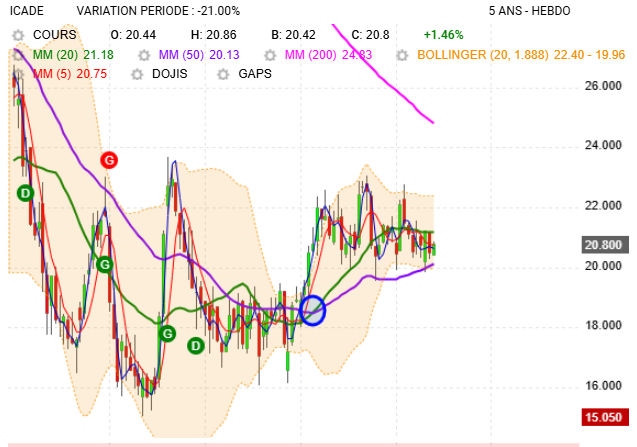 Cela dit le titre est rentré dans une phase de stabilisation. la MM200 (rose) donne la tendance long terme qui est et reste baissière. autant j'avais repéré le croisement de la MM20 (cercle bleu) et de la MM50, acheté puis recédé dès les 23€ atteints, autant j'attendrais que la MM20 recroise à la baisse la MM50 pour recommencer à la re-suivre.