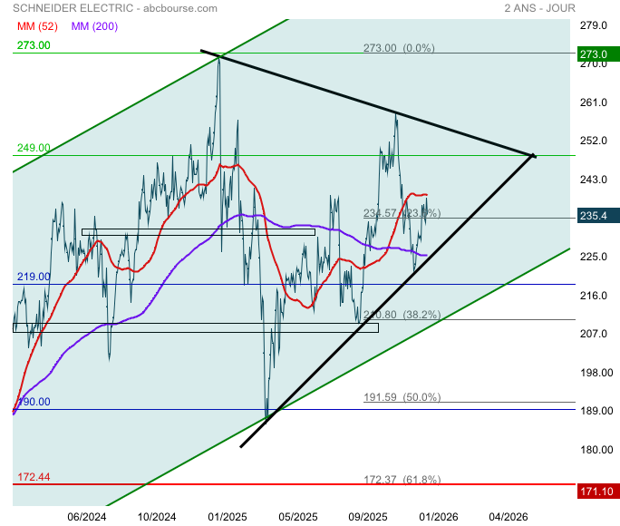 Schneider est dans une tendance haussière LT mais on note en daily la formation d’un triangle de sommet marquant l’idée que les investisseurs hésitent à suivre