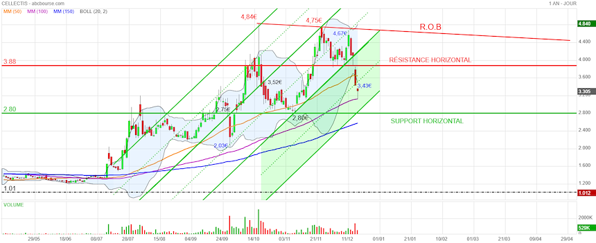 Si on reporte l’écart entre le PB du 29/9 (2,03€) et le PH du 16/10 (4,84€) - soit 2,81€ - au PB du jour (3,11€), on peut théoriquement viser 5,92€.
