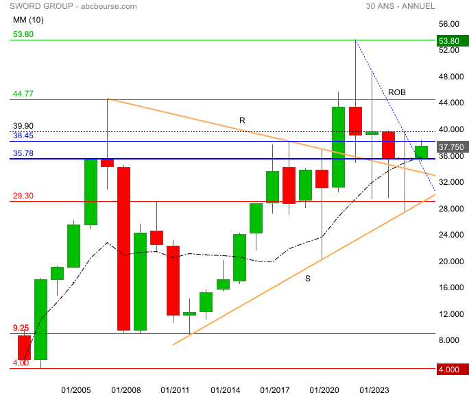 triangle RS : sortie haussière l’oblique ROB et un seuil majeur 35.78€ qui coïncide mm10
