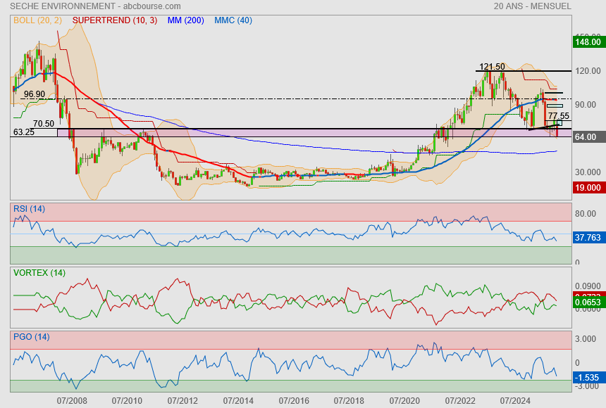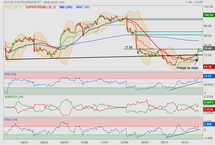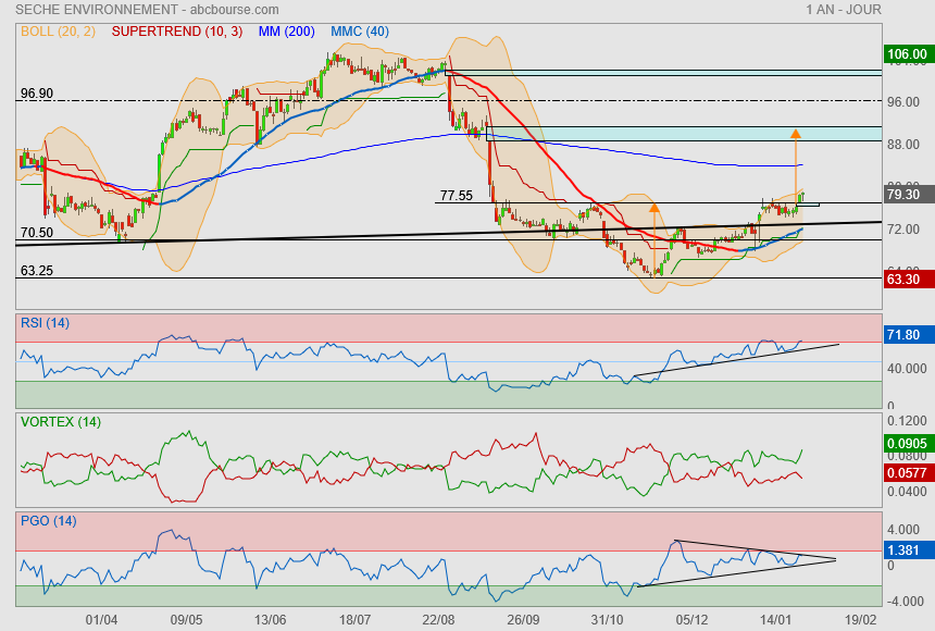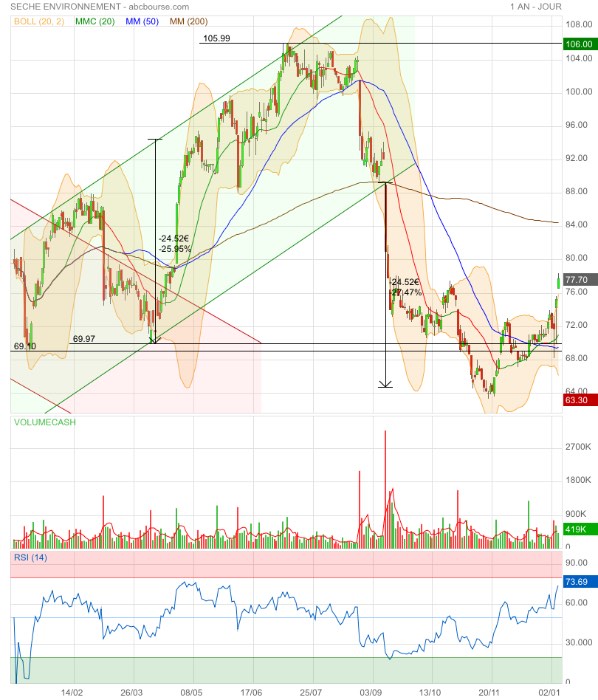 (Boursier.com) — Séché Environnement grimpe de près de 3% à 77,50 euros ce mercredi après l'annonce en début de semaine de deux acquisitions qui confortent son leadership au cœur de deux pays stratégiques pour le développement international du Groupe : le Chili et l'Italie.