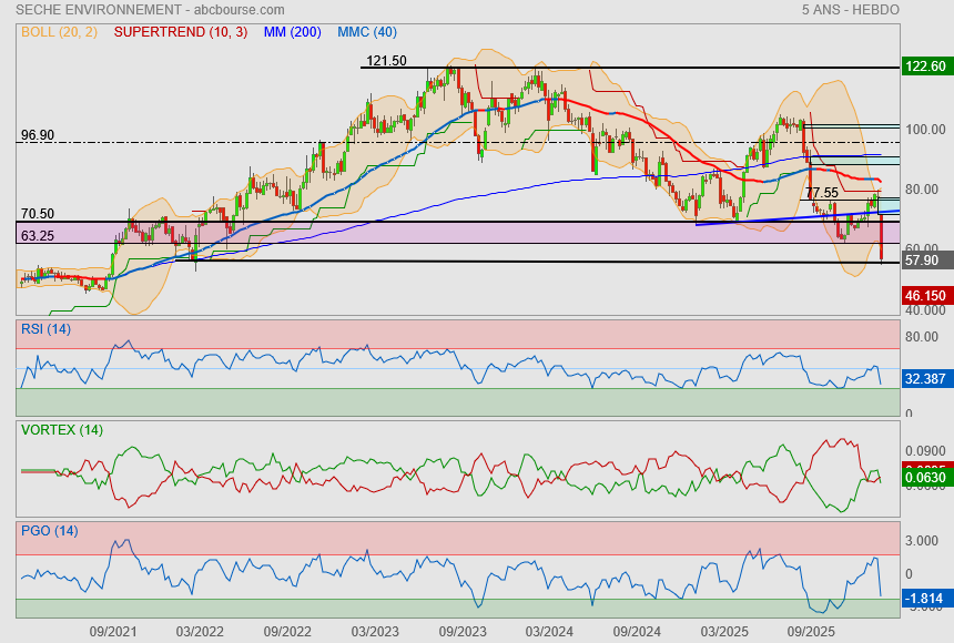 Les acquisitions de ces deux sociétés au profil de rentabilité très élevé devraient être finalisées dans les prochaines semaines. Ces deux acquisitions seront financées par la trésorerie disponible du groupe, avec un impact sur la dette financière nette de l'ordre de 230 ME. "Ces deux acquisitions seront relutives sur l'EBITDA (marge 2025 Séché entre 21 et 22%) et augmenteront la part du CA International (environ 1/3 avant ces opérations)" commente Portzamparc qui estime que ces opérations "sont un peu plus importantes que les bolt-on auxquelles nous pouvions nous attendre après le groupe Flamme, mais elles sont stratégiques (exposition industrielle, valeur ajoutée, potentielles synergies) et apporteront de la récurrence comme de la croissance. En première approche, la DFN 2026 pourrait représenter 3,1xEBITDA vs 2,6 x avant ces opérations, qui seront financées sans nouvelle émission de dette après les levées 2025" estime l'analyste qui vise un cours de 89 euros avec un avis à 'conserver' sur le dossier.