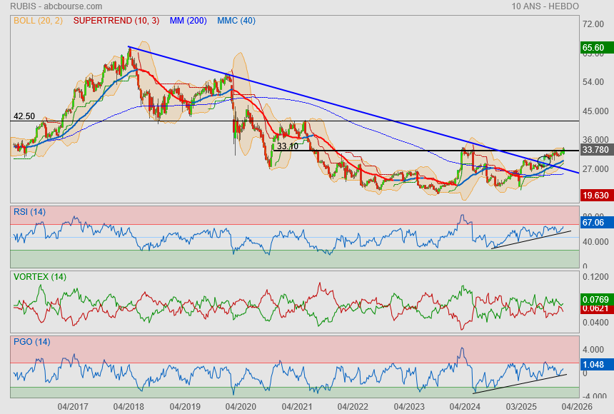 Résultat. Le résultat net de ce distributeur de carburant très présent en Afrique et dans les Caraïbes a augmenté en moyenne de 11% par an sur la période 2014-2024. L'activité est portée par l'évolution démographique, l'enrichissement de la classe moyenne et le développement du réseau routier dans les zones couvertes. Pour élargir son spectre vers les énergies vertes, Rubis a pris le contrôle de Photosol qui développe des parcs solaires... Alors que l'Ebitda était de 721 ME en 2024, il est annoncé entre 710 et 760 ME cette année. Le rendement atteint le niveau confortable de 6,8% compte tenu du dernier coupon de 2,02 Euros.