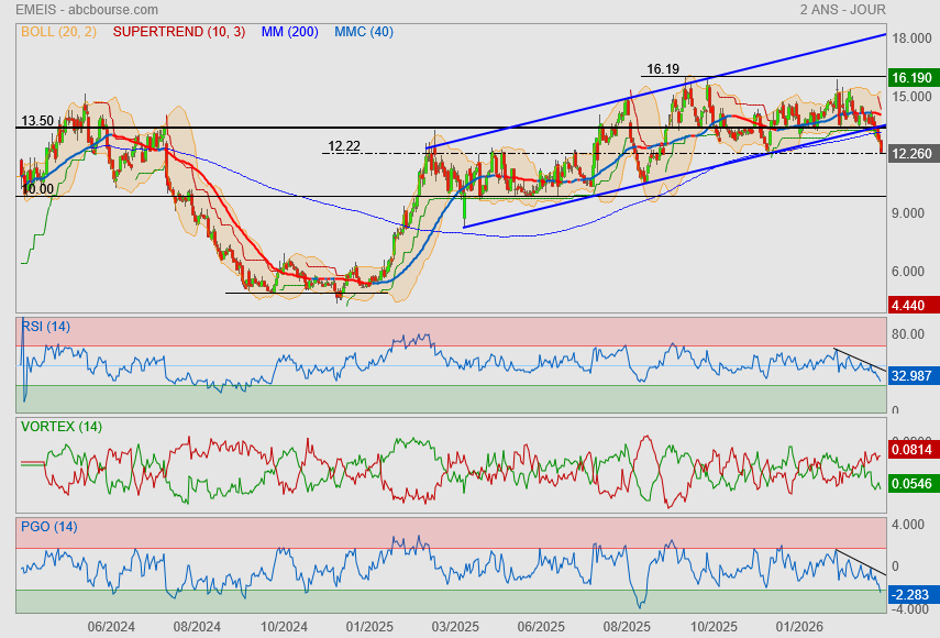 • Moyennes Mobiles : La MM100 (verte) et la MM200 (bleue foncée) agissent comme des supports de fond vers les 13.20€ - 13.50€. Le fait que les MM soient horizontales confirme l'absence de tendance directionnelle forte à court terme (range).