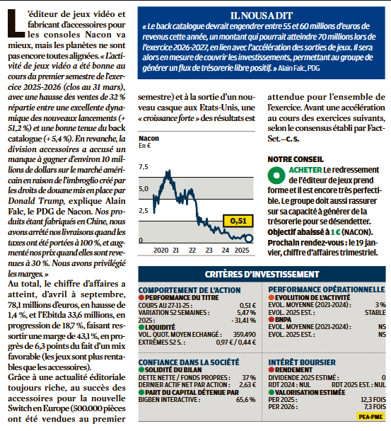 NACON (ISIN FR0013482791) annonce ce jour ses résultats semestriels consolidés (période du 1er avril 2025 au 30 septembre 2025) pour l’exercice 2025-2026, examinés par le Conseil d’Administration en date du 24 novembre 2025. Les procédures d’examen limité par les commissaires aux comptes sont en cours, le rapport d’examen limité des Commissaires aux Comptes sera émis lors de la publication du rapport financier semestriel.