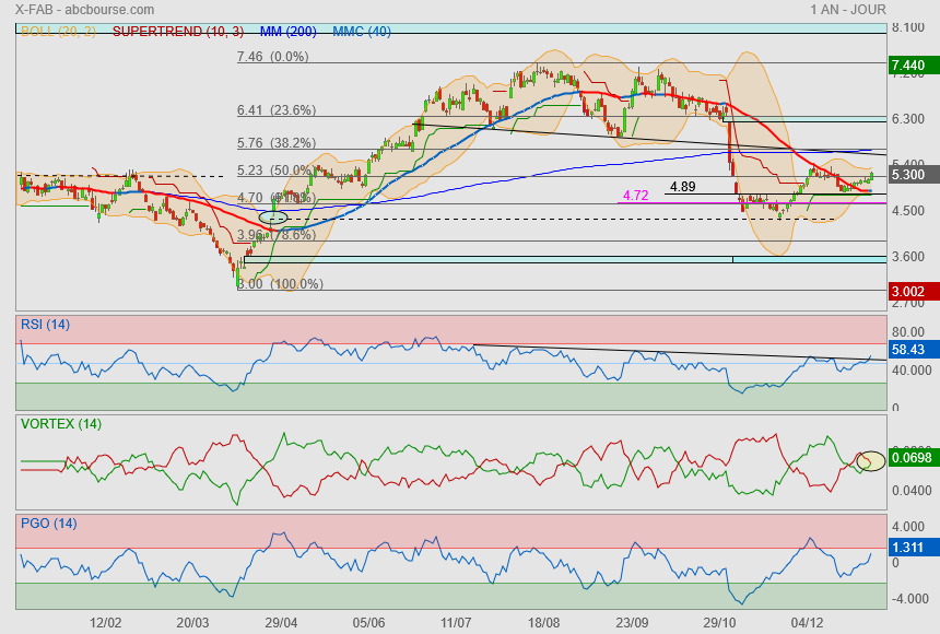 L'analyse graphique en données quotidiennes de l'action X-FAB permet d'identifier une tendance haussière à court terme depuis la figure de retournement des 4, 7 et 8 avril, sur un pic de volumes. Parmi les facteurs graphiques dominants, nous avons relevé la présence d'un gap haussier sur les cours de l'action X-FAB. Formé le 10 avril, ce fossé de cotation a marqué un emballement du camp acheteur. Sur le plan des indicateurs de tendance, la moyenne mobile à 20 jours (en bleu foncé) fait office de support pour les cours.