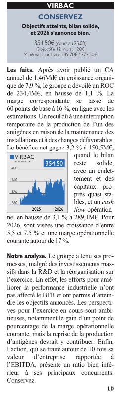 Rappelons que Virbac avait déjà relevé ses objectifs en décembre, grâce notamment à la reprise du marché des animaux domestiques (60% du chiffre d’affaires) et aux acquisitions de Sasaeah au Japon et de Globion en Inde, dont le laboratoire a annoncé, le 3 juillet, qu’il détenait à présent la totalité du capital. Virbac veut en faire une tête de pont pour s’étendre en Asie. Ses ratios restent raisonnables, avec un cours sur bénéfice de 22 estimé pour 2024.