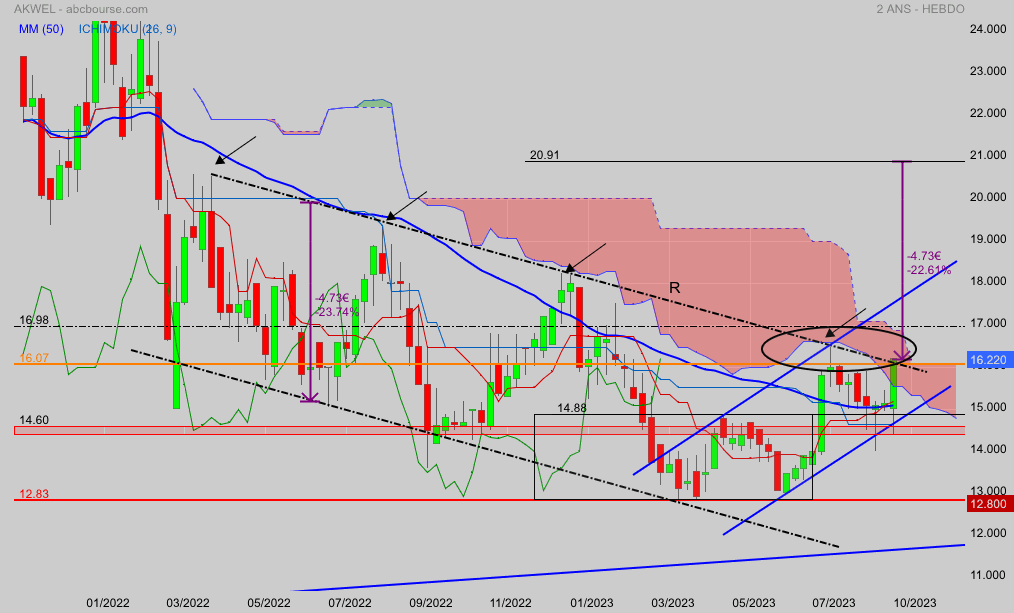 Akwel ont voit très bien le nuage en ichimoku et son nuage qui est rempart aux bulls mais son épaisseur sera moindre la semaine prochaine 16.22 qui correspond également à une forte résistance annuelle 16.02
