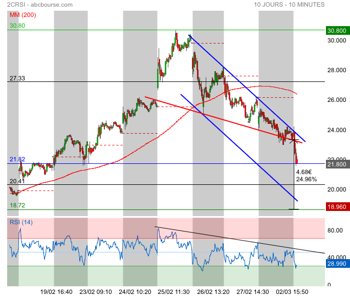 2CRSI perd déjà 8% depuis ce matin, votre prévision voudrait dire une perte de 21.51% (23.85 - 18.72 / 23.85) en une journée, ce que même la situation internationale ne justifierait pas !