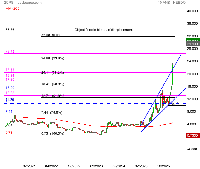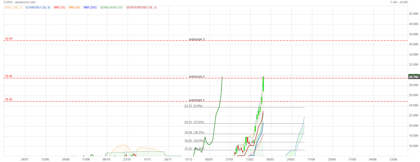 Le cours a touché le max de l’extension 3.05/15/10.10 soit 261% si le cours poursuit son ascension je suis revenu à la base du biseau d’élargissement et sa sortie haussière objectif env 33.56 et fibonnacci notre ami en partant de 0.73 et 7.44 comme ratio 78% on a 100% 32.08€ ce n’est que des observations dans un cours explosif