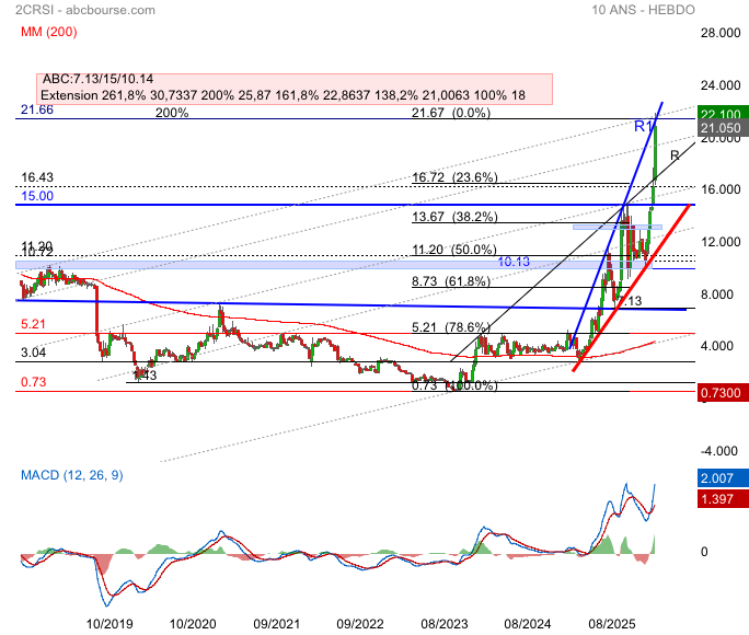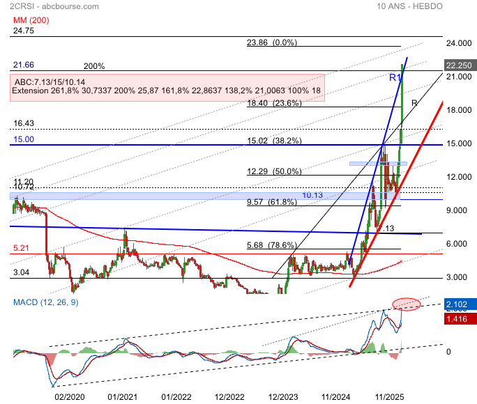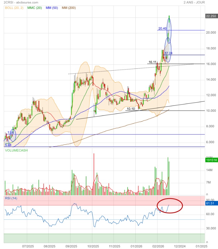 Avec une performance sur 1 mois de +70,6 % et +318,8 % sur 1 an, 2CRSI écrase ses moyennes historiques, mais une telle accélération attire souvent des prises de bénéfices.