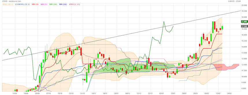 Le cours est au-dessus de la Tenkan (16,196 €) et de la Kijun (14,283 €), ce qui confirme une tendance haussière solide.