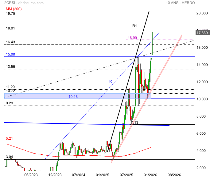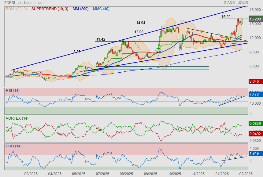 "L'action 2CRSi flambe de 51% depuis le 1er janvier. Elle sort de deux exercices exceptionnels ( 189% en 2025 et 164% en 2024), portée par une narration positive et confirmant son statut de valeur la plus étroitement liée à l'IA de la cote parisienne. Sa valorisation reste modérée en dépit des gains récents, au regard de certains acteurs de l'IA, car elle reflète un historique de résultats inégaux et des niveaux de marge relativement faibles. Le principal défi de l'entreprise est de gérer l'afflux de chiffre d'affaires sans dégrader cette rentabilité fragile.