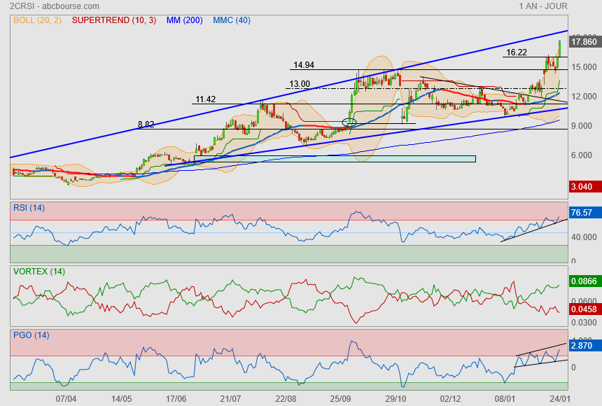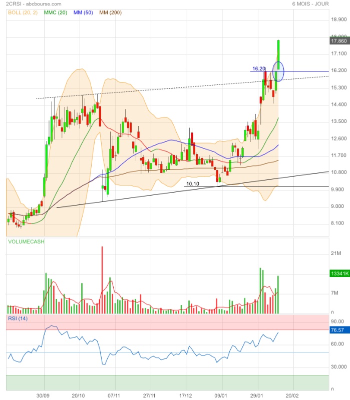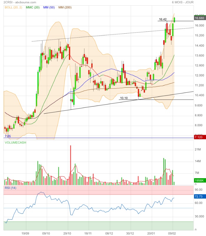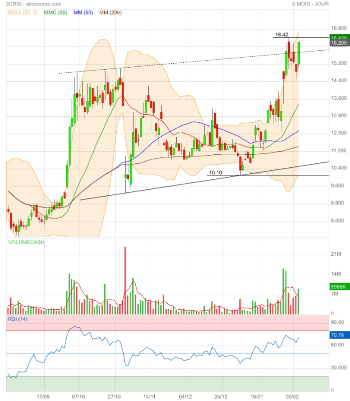 De jolis volumes en séance pour finir au +haut ; voilà qui est positif. On approche du +haut 16,42 € ; le franchir serait encore plus positif. On surveillera un possible double top sur ce montant pour prendre ses bénéfices.
