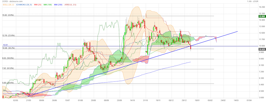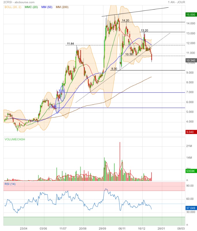 Le niveau des 38.2% (10.44€) a été testé et enfoncé en séance (cours actuel à 10.42/10.48).