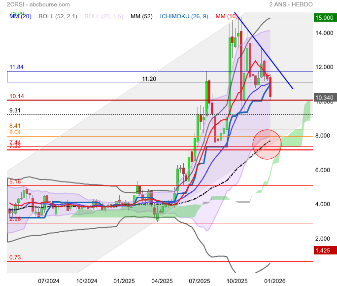THÉORIE:Sa rupture + cours << TS-Kijun ichimoku hebdomadaire valide théoriquement un retour Bb basse 20 ou mm52 qui coïncident (éclipse rouge) vers 8€