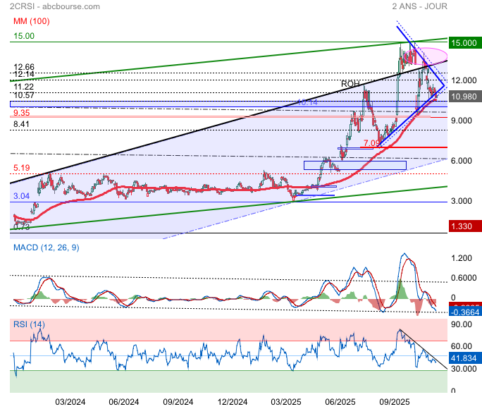 (Boursier.com) — 2CRSi se recale en hausse de 1% ce vendredi à 11,10 euros, alors que le groupe a publié dernièrement ses résultats annuels pour l'exercice 2024/2025. Le chiffre d'affaires consolidés s'est établi à 220,7 millions d'euros, en progression de +32% par rapport au proforma 2023-2024 (167,6 ME sur 12 mois). Sur un marché toujours dynamique et exigeant, 2CRSI enregistre une forte progression et confirme sa solidité opérationnelle. "Cette performance témoigne du renforcement des positions commerciales du Groupe sur ses marchés clés de l'Intelligence Artificielle, calcul à haute performance et data centers", dit le management. La marge brute de l'exercice et notamment du 2e semestre a été ponctuellement affectée par l'octroi d'une remise exceptionnelle consentie à l'un des principaux clients du groupe aux Etats-Unis, en compensation d'un retard de livraison. L'Ebitda ressort à 5,6 ME, confirmant la capacité du Groupe à préserver sa rentabilité dans un contexte d'expansion toujours à un niveau soutenu.