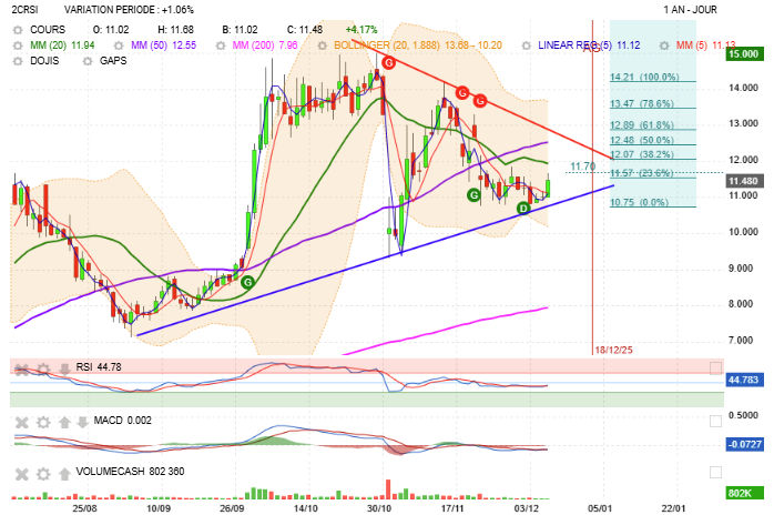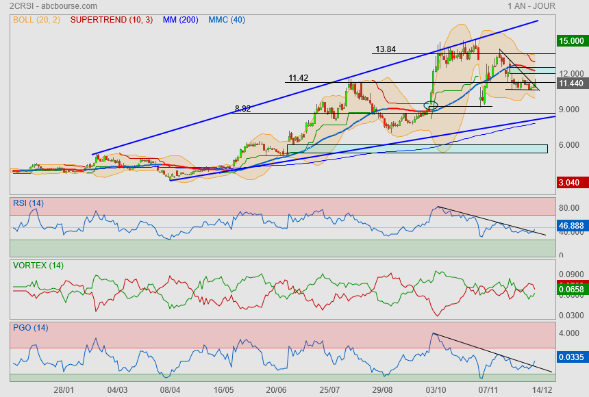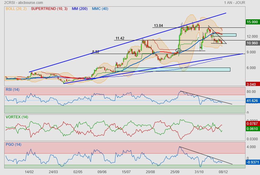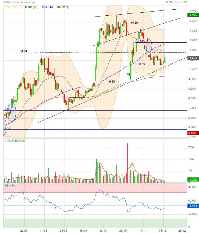 Recentrage dans l'angle de compression. Le passage des 11.7€ puis du fibo 38.2 (12.07€) et de la MM20, confirmerait le début d'une nouvelle tendance haussière. Certes les indicateurs RSI et Macd s'inversent et s'orientent à la hausse, mais le volume reste très faible...donc c'est pas très significatif.