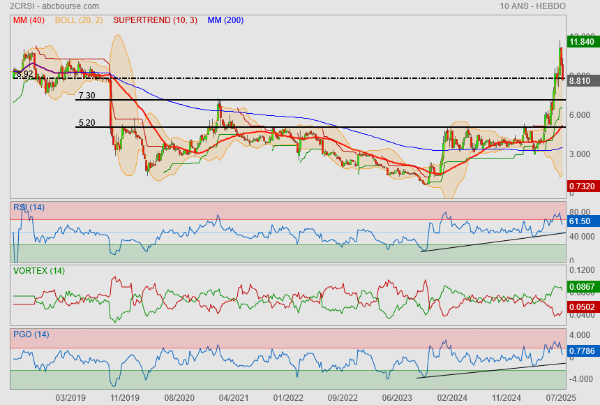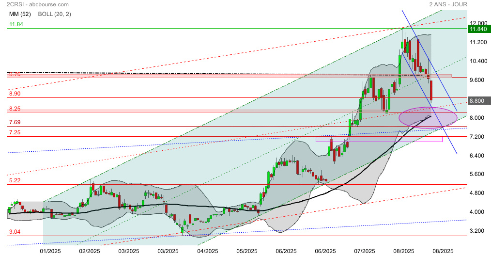 si 8,90€ cède, (ça y ressemble en ce moment), rendez vous autour de 8,20€ qui correspond aussi à la partie basse des bandes de Bollinger.