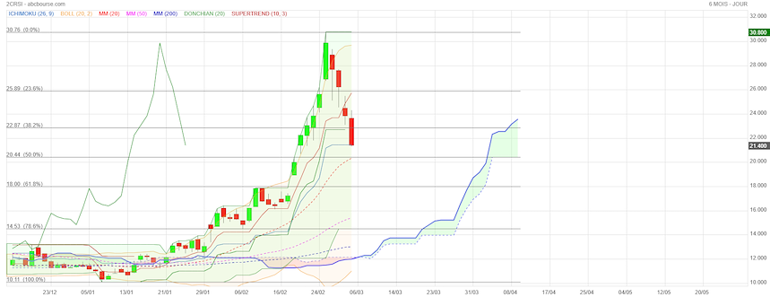 Pour l’instant la bourse baisse mais ne panique pas si c’était le cas tu verrais 2CRSI a des cours inimaginable je fais de la bourse 1990 j’en ai vu des choses