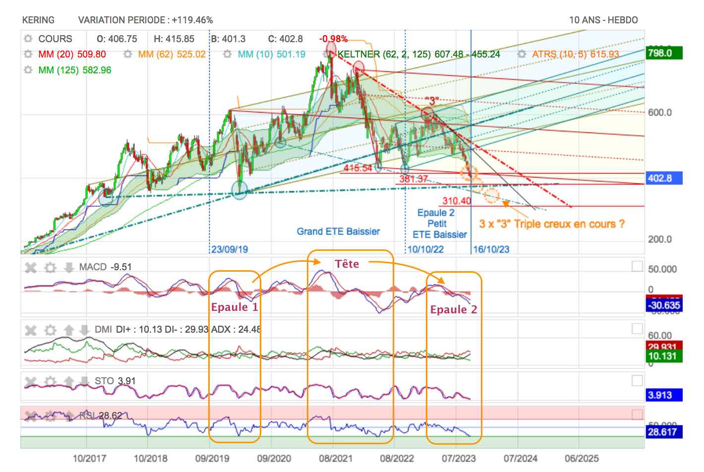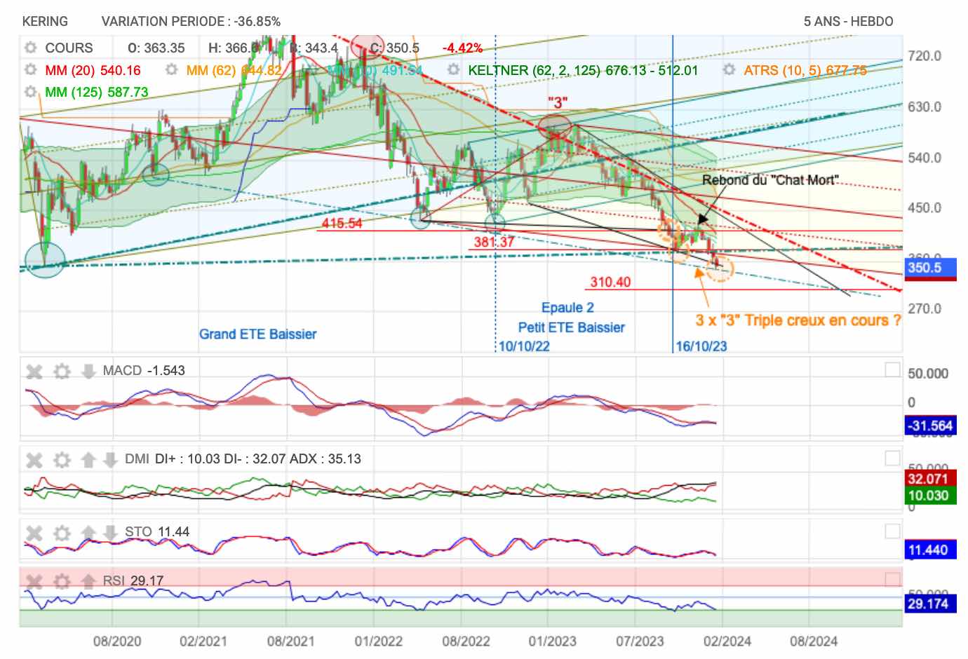 On arrive à la fin d'éxécution du programme baissier que j'avais signalé en octobre 2023, à savoir 3 triples creux haussiers consécutifs ( cercles pointillés orange) :