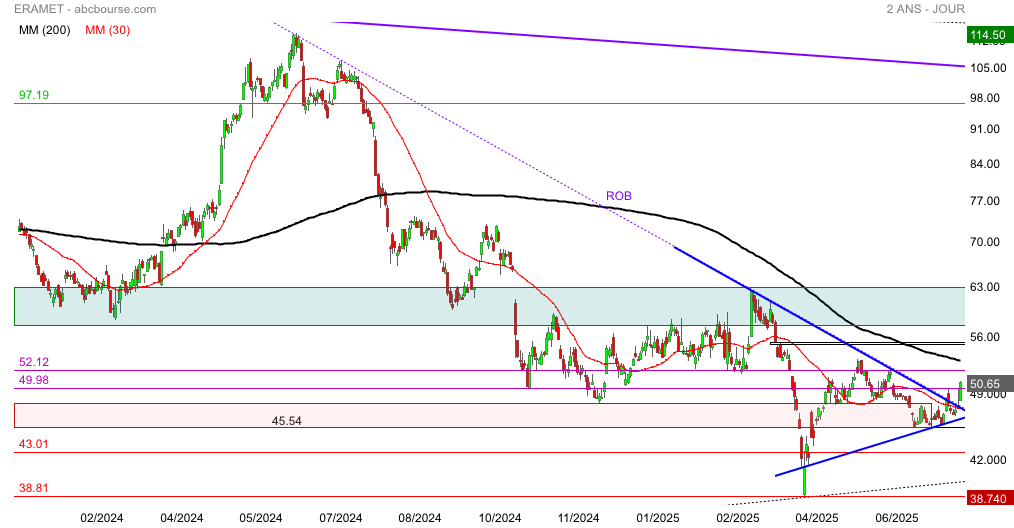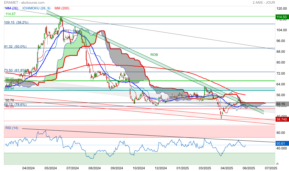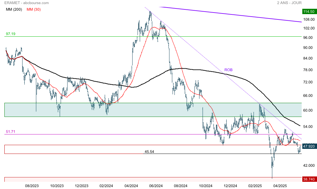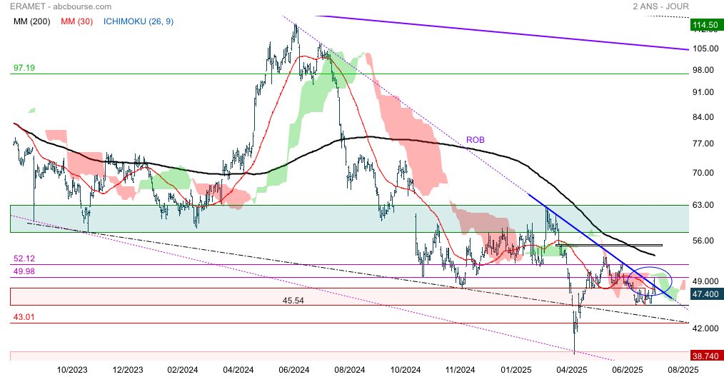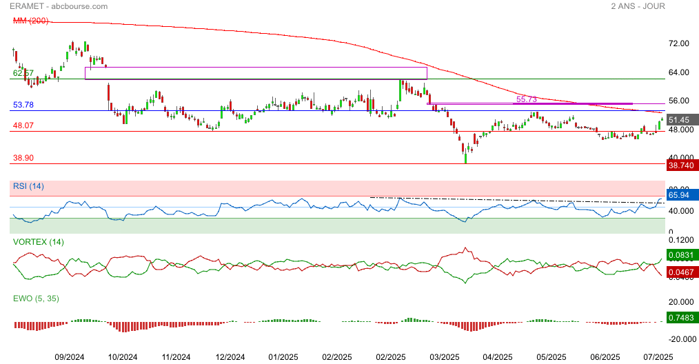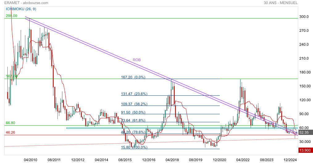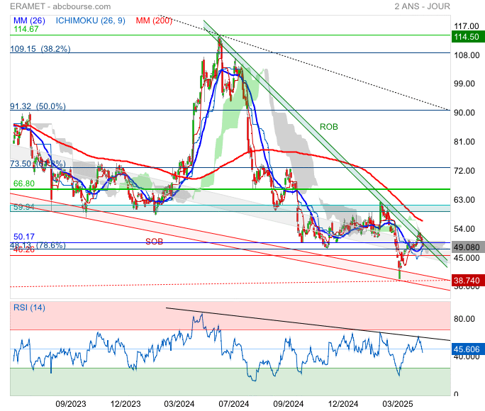 Eramet est à contre courant de la tendance et elle pourrait s’alourdir si 48.13€ fibonnacci 78% venait a céder