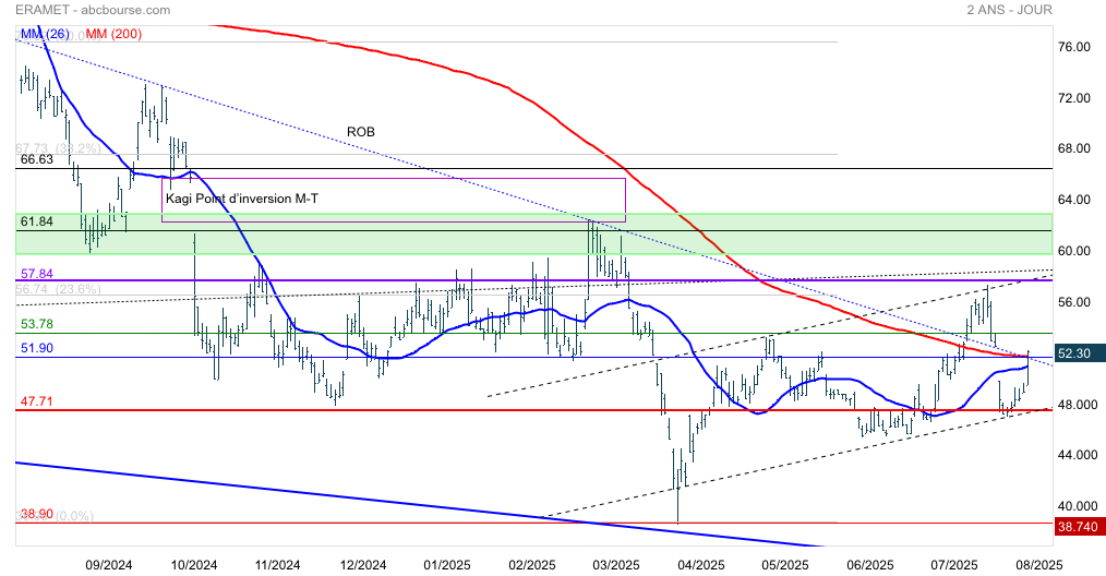 Test majeur journalier en cours .. prix>>mm26 qui en croisant la mm200 permettrait d’accélérer vers le seuil de 57.84 kagi résistance annuelle