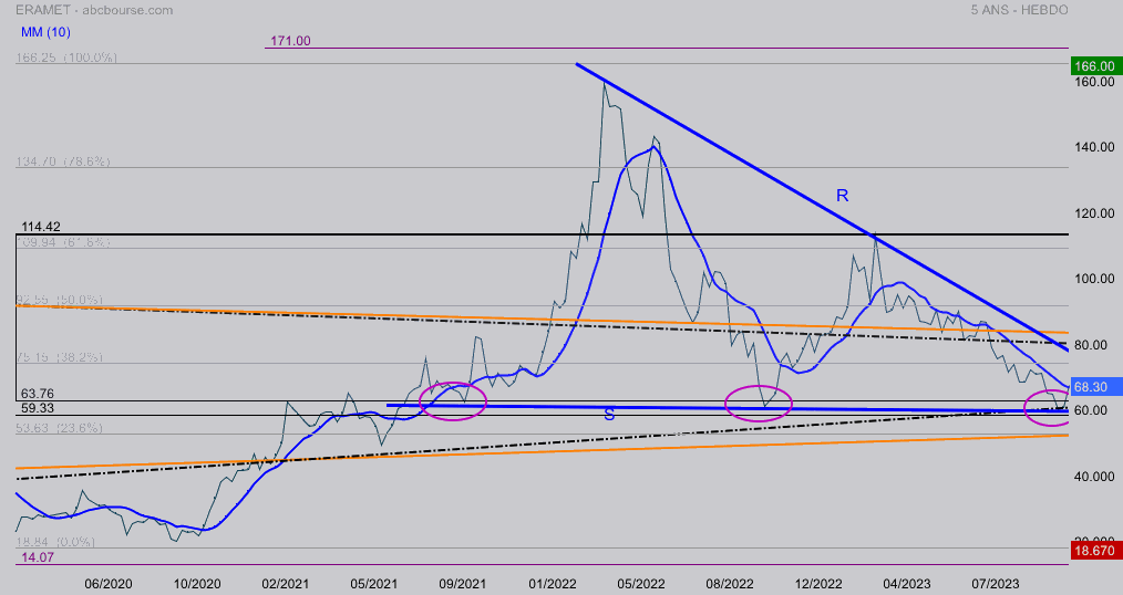 En cette fin de semaine le cours teste la mm10 hebdomadaire , son franchissement ouvrirait la voie
