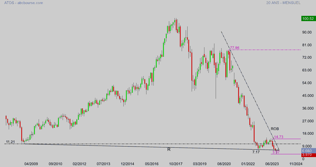 Dans cette unité de temps on peut aussi considérer une oblique point de départ (14.73-06/2022) passant par 3 pts ou le cours a échoué en clôture dont le prix= 6.81