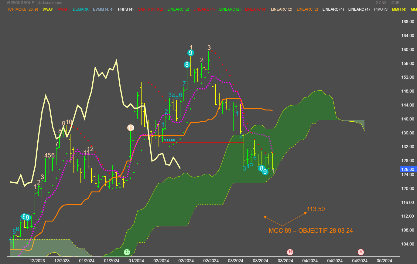 Lentement mais sûrement à l'approche de la publication des résultats le 28/03/24, on descend vers les 113.5 de la MGC 89 (flèches ocres).