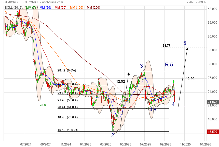 Au 27 septembre, la situation financière nette de STM est restée solide à 2,61 Mds$ au lieu de 2,67 Mds$ au 28 juin 2025, reflétant un montant total de ressources financières de 4,78 Mds$ et un endettement financier total de 2,17 Mds$. Parmi les derniers avis de brokers, Morgan Stanley a ajusté son objectif de 26 à 20 euros, tandis que HSBC reste lui à l'achat, mais ramène sa cible de 30 à 28 euros. BNP Paribas Exane est toujours à 'surperformance' sur STM, mais avec un objectif ramené de 29 à 26 euros, alors que Jefferies reste aussi à l'achat mais avec une cible abaissée à 26 euros, tandis que TD Cowen conserve le titre en visant un cours ajusté à 21,50 euros. Oddo BHF reste enfin à 'surperformance', mais avec un objectif minoré à 28 euros.