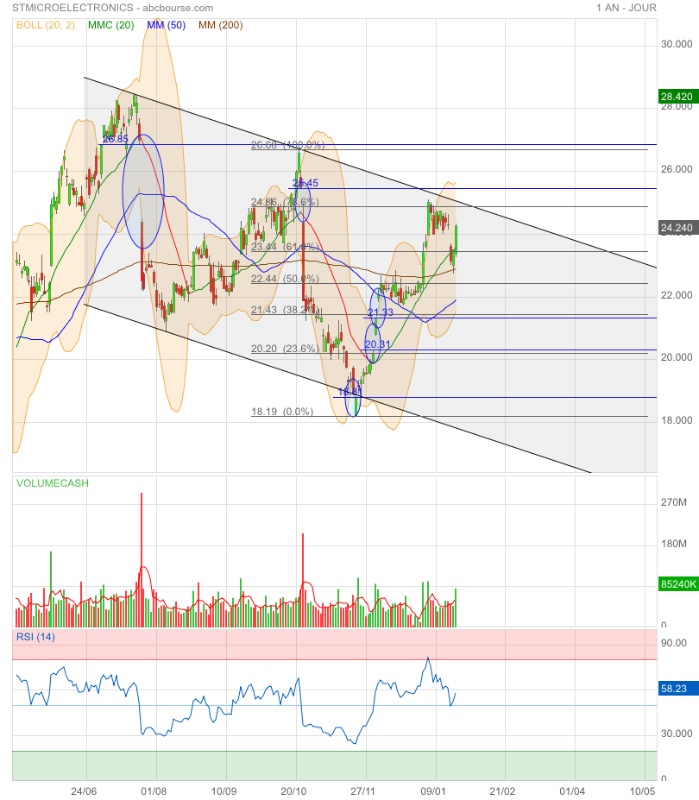 Le groupe franco-italien bénéficie d'une actualité sectorielle porteuse avec les très bonnes publications d'ASML en Europe et de Texas Instruments aux Etats-Unis. Pour le premier trimestre fiscal de son nouvel exercice, le groupe texan mise sur des revenus allant de 4,32 à 4,68 milliards de dollars, ainsi qu'un bénéfice par action de 1,22 à 1,48$. Des prévisions supérieures aux estimations des analystes.