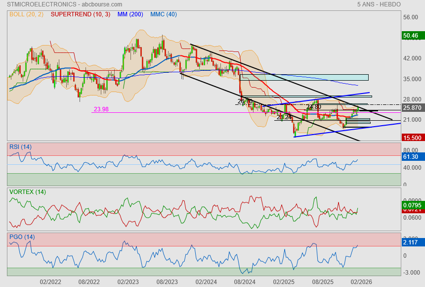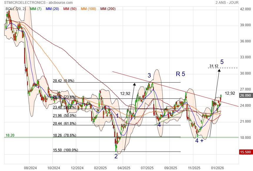 Oddo BHF ('surperformer') anticipait une réaction positive du titre suite à cette publication, portée par l'espoir de reprise. L'analyste maintient son opinion positive sur STM, convaincu que le titre devrait bien performer en 2026 grâce à l'amélioration du newsflow. Selon ses estimations, l'action se négocie à 7,8 fois l'EBITDA prévisionnel 2026, soit en dessous de sa moyenne sur 5 ans (environ 9 fois) et en dessous d'Infineon (13 fois).