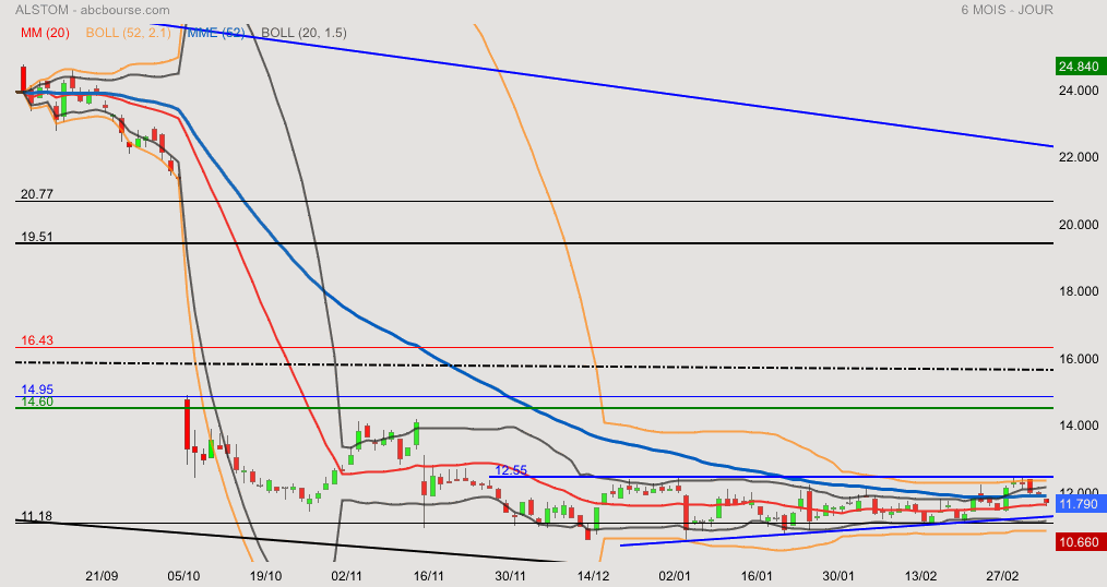 Alstom pas besoin de plus d’analyse tout est dans le graphe compression bollinger 20-52 moyennes mobiles = préparation mouvement directionnel 12.55 à la hausse ,11.18 bollinger basse à la baisse