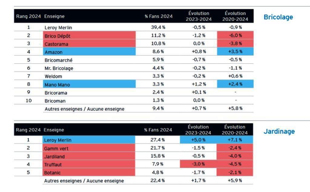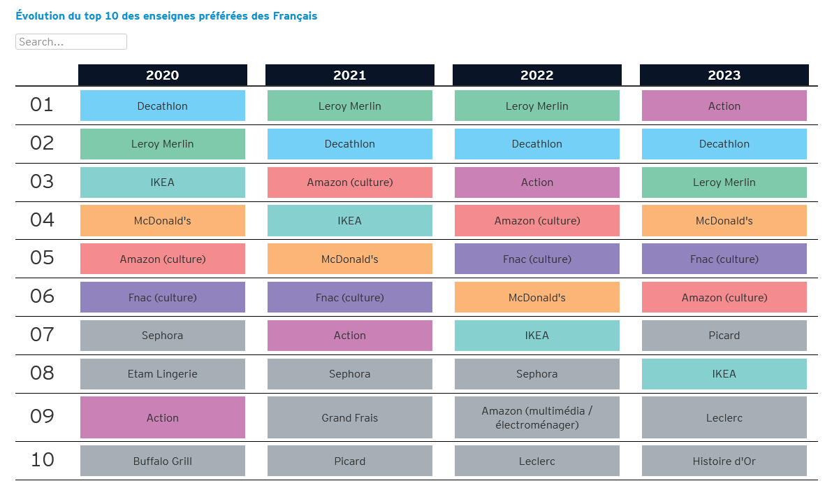 Pour la première fois, Action devient l’enseigne préférée des Français tous secteurs confondus, avec le plus fort taux de fans (46,0%). Action devance deux habitués du podium : Decathlon (42,5%) et Leroy Merlin (39,9%).