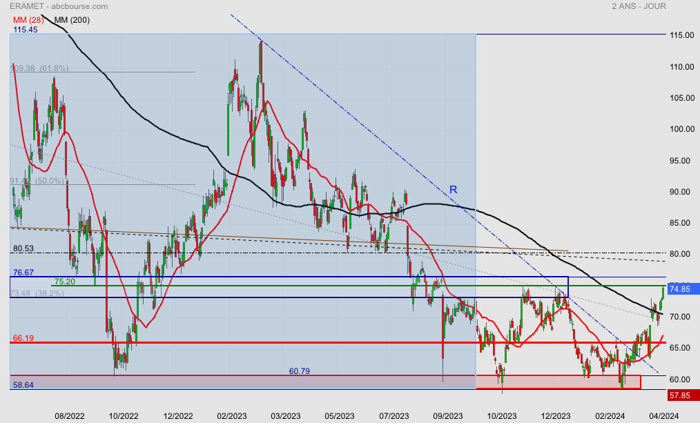 38.2%: 73.48€ comme résistance, cela ouvrirait 80.50 dans un premier temps