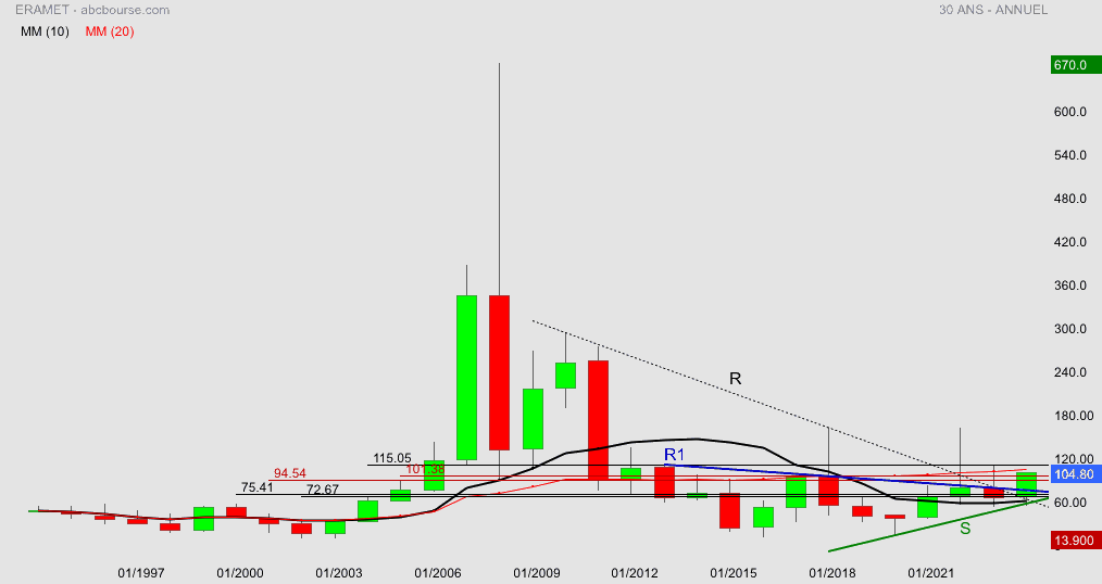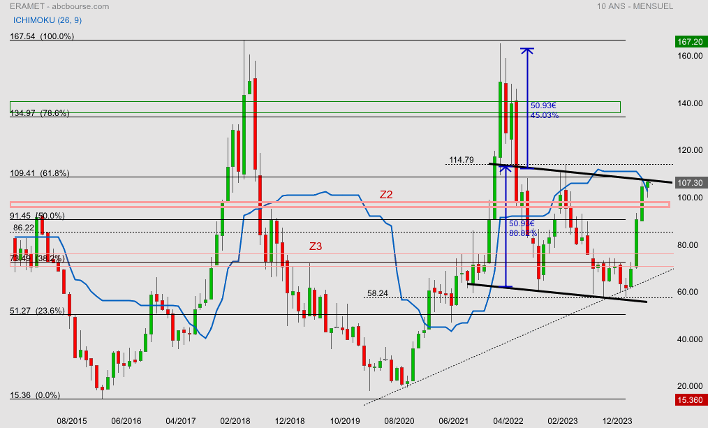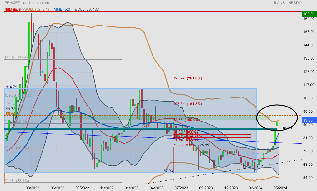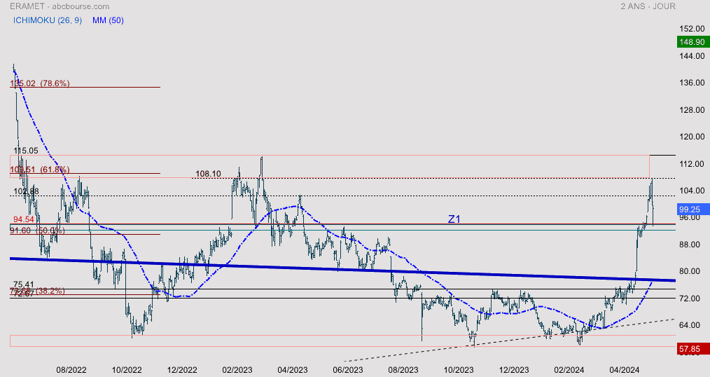 Le maintien d'Eramet dans le portefeuille PEA sportif. est donc conseillé, en anticipant des résultats positifs pour l’année 2024. Pour rappel, nous visons l’objectif des 148,40€ sur le titre, soit un potentiel de hausse de plus de 45% à moyen / long terme par rapport au cours actuel. Le rendement de son dividende annuel est supérieur à 2,5%.