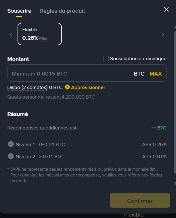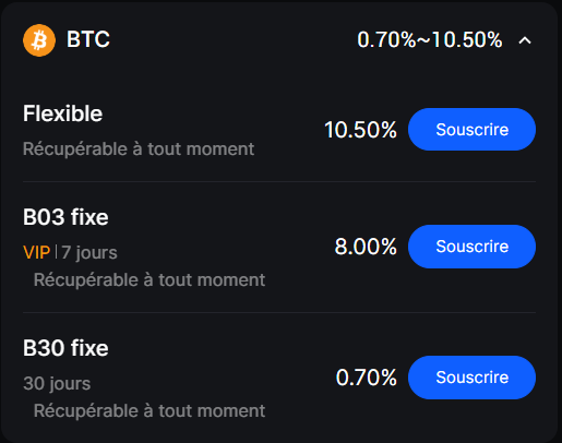 Si si bien sûr on peut staker le BTC, en fixe ou variable ça dépend de ce qui est proposé mais on peut staker, 0,26% sur binance, et 10,5% sur BingX dans la limite de 0.01 BTC