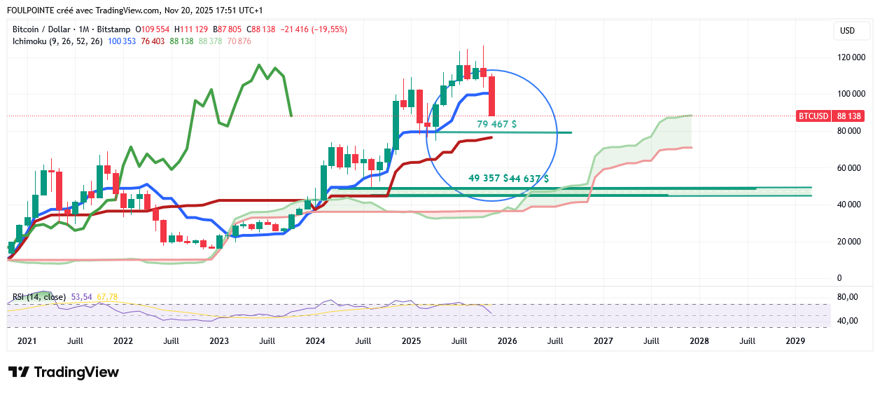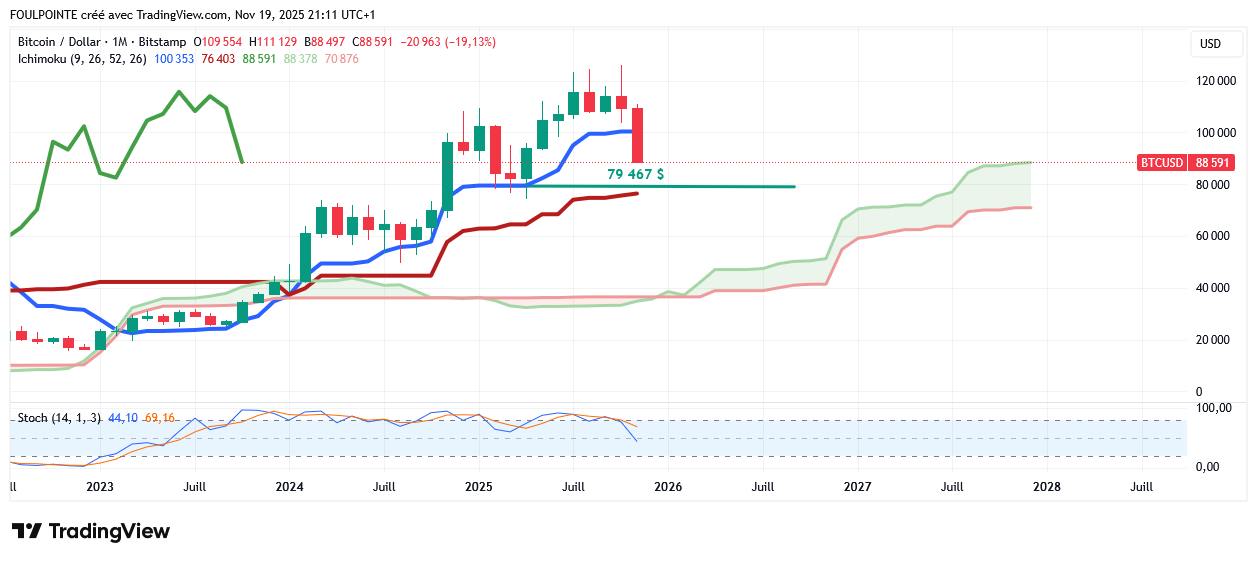 Ça pourrait être la dernière station avant la touchette finale : les 76 403 $ c-a-d la kijun en mensuelle. Les cours n'ont pas fait cette descente pour rien.