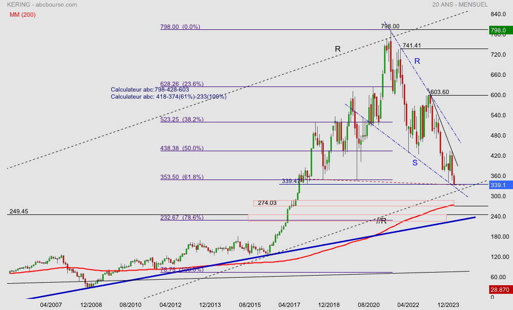 Mais cela résiste… sur le graphe on visualise très bien le grand saut si cette zone cède dont le point de départ 129€ en 2016. Le premier point intermédiaire vers 274 ou gravite également la mm200 mensuel