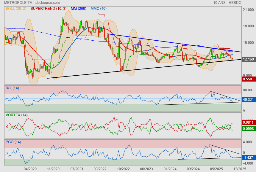 Dividende. Sur ces neuf premiers mois de 2025, la marge opérationnelle était de 15,9% contre 16,8% sur la période équivalente de 2024. Il n'empêche que le titre est peu cher avec un PER de 11 estimé pour l'année en cours. Alors que le dividende versé à ses actionnaires par M6 au titre de 2025 est de 1,25 Euros, le rendement retient l'attention car il atteint 10,7%... Enfin, l'armateur CMA CGM fait figure de candidat naturel à la reprise de la chaîne, ce qui entretient un aspect spéculatif.