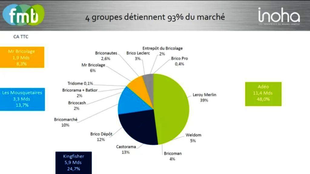 Les Mousquetaires sont en troisième position avec 13,7 % de PDM (3,3 milliards d’euros) avec Bricorama, Batkor, Bricocash, Bricomarché et Tridôme.