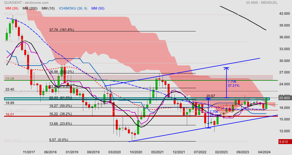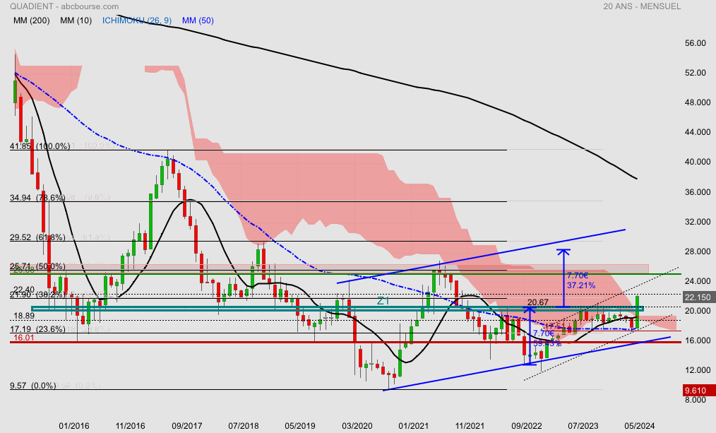 J’indiquai sur la dernière analyse que le prix avait une fenêtre extraordinaire pour franchir le nuage ichimoku mensuel il l’a fait, s’extrayant également de la zone de résistance Z1 puis ratio finobacci 38.2% du mvt débuté 41.85 a 21.90€´ une dernière résistance 22.40 devrait ouvrir un potentiel en direction 25-26 fibonnacci 50% puis un second objectif graphique flèche bleu vers 29-30 fibonnacci 61.8% Biensur ce sont des objectifs MT